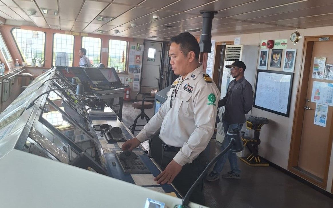 Kapten Adi Nugroho saat memantau pelayaran di Kapal Papandayan. (foto: Dokumentasi PIS/Mistar)
