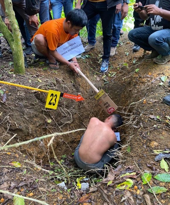 Polres Tanah Karo menggelar rekonstruksi kasus pembunuhan Melky Refanta Perangin-angin (32), yang jasadnya ditemukan terkubur di areal perladangan Seledang, Desa Ndokum Siroga, Kecamatan Simpang Empat, Kabupaten Karo, Kamis (23/10/2025).