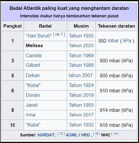 Badai Melissa resmi masuk dalam jajaran badai Atlantik paling kuat sepanjang sejarah. Badan Meteorologi Dunia (WMO) mencatat tekanan udara minimum mencapai 892 mbar, menjadikannya salah satu dari tiga badai terendah tekanan di Atlantik.