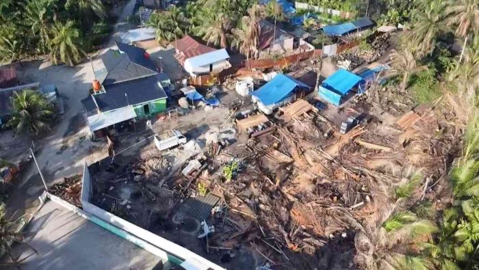 Bekas dapur pengolahan minyak mentah yang terbakar di Desa Padang Cermin Kecamatan Tanjung Pura (18/4/2023). (foto: Istimewa/mistar )